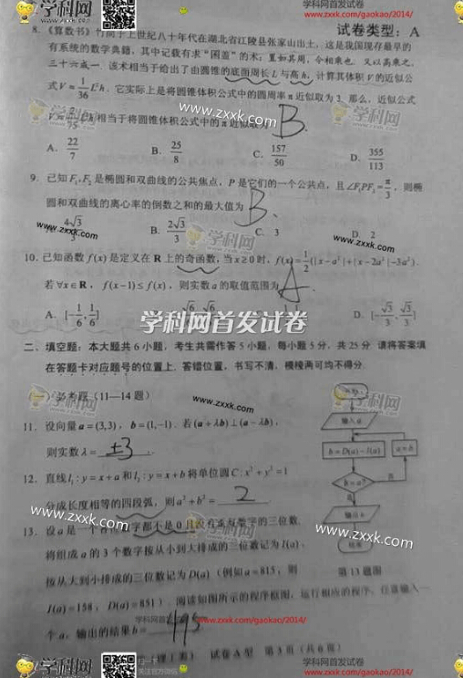 2014年湖北高考數(shù)學(xué)(理)真題及答案(圖片版)(3)