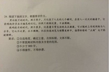 廣州日報:2014廣東高考作文題出爐,是材料作文。“數碼技術的時代,照片很多,記錄著日常生活的點點滴滴,可隨時上傳到網絡與人分享。它從不泛黃,永不模糊,但在快速瀏覽與頻繁更新......”