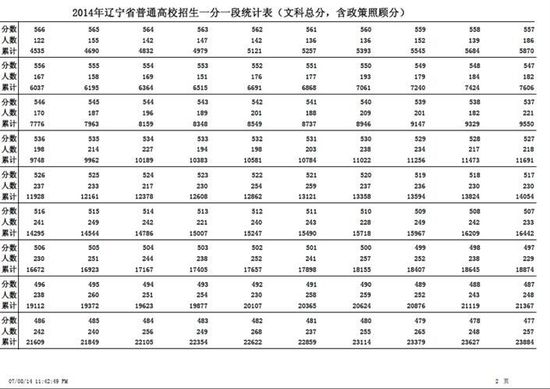 2014年遼寧高考文科一分一段統(tǒng)計(jì)表(含照顧分)(2)
