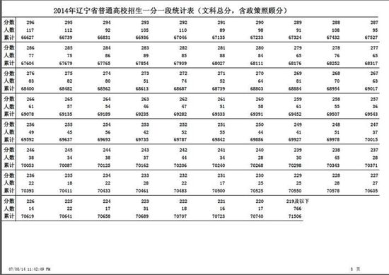 2014年遼寧高考文科一分一段統計表(含照顧分)(5)