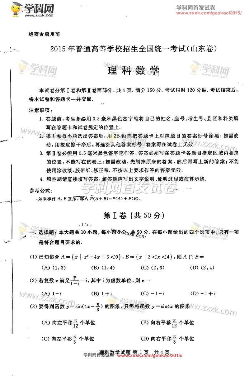 2015年山東高考數學(理)試題及答案解析