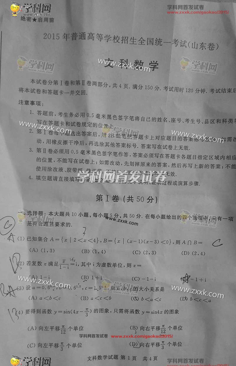 2015年山東高考數(shù)學(xué)(文)試題及答案解析