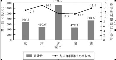 注:增速是指與去年同期相比的增加速度。北京、天津、上海、重慶、廣州五市GDP增速比去年同期的增速分別提高了5.4個、2.6個、2.2個、2個和2.6個百分點。
