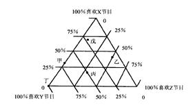 下面的三角形表示甲、乙、丙、丁、戊五個(gè)城市的中學(xué)生對(duì)X、Y、Z三個(gè)電視節(jié)目的喜歡情況調(diào)查結(jié)果。如甲城喜歡X節(jié)目的占30%,喜歡Y節(jié)目的占70%,無人喜歡Z節(jié)目;而丙城20%喜歡X節(jié)目,50%喜歡Y節(jié)目,30%喜歡Z節(jié)目。